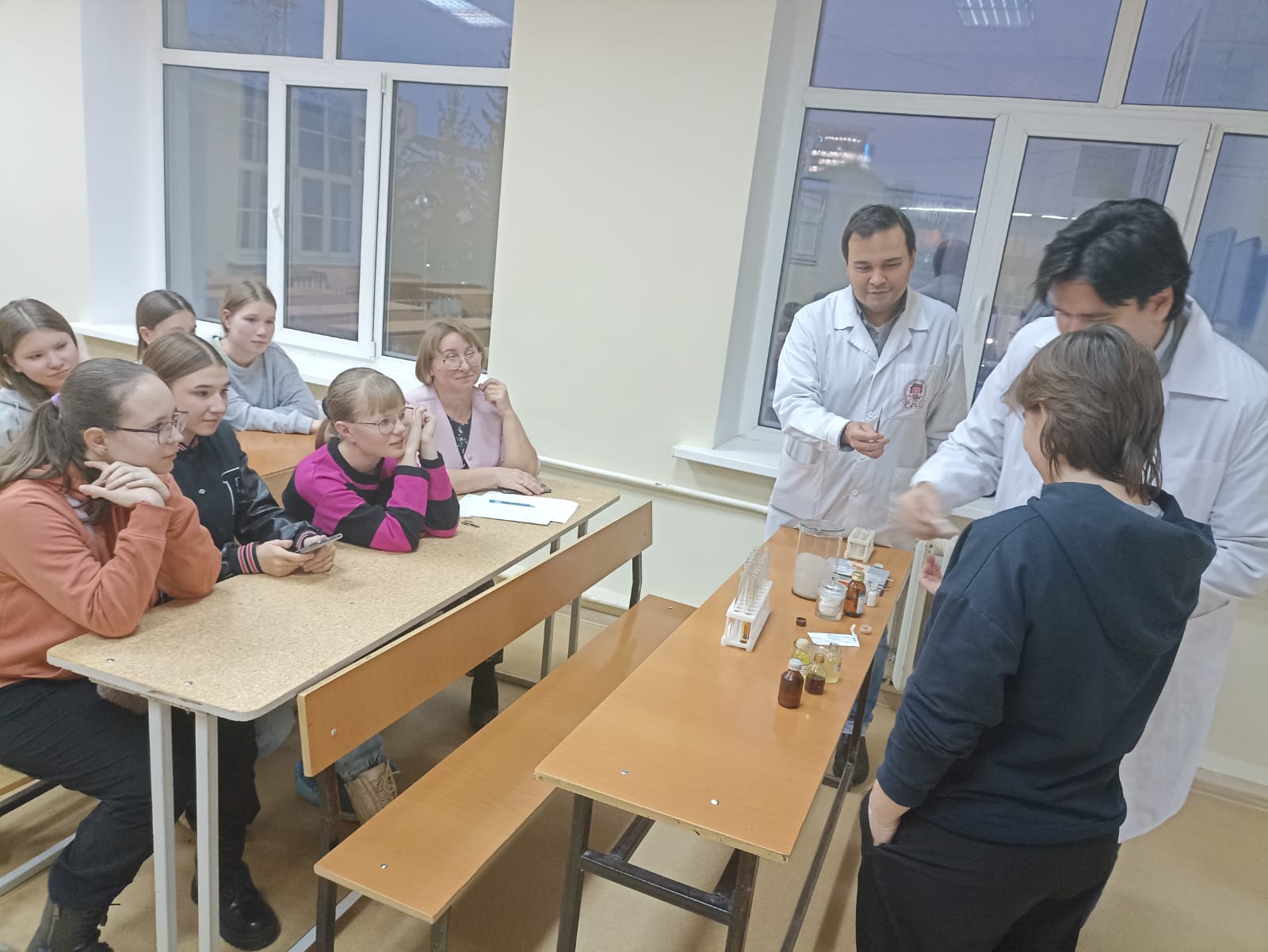 Эстафетную палочку приняли доценты кафедры фармацевтической, аналитической и токсикологической химии Шарипов Ирик Мунирович и Уразбаев Максат Азатович, рассказали о синтезе молекул разными способами, провели со слушателями игру-викторину на знание химии и показали химические реакции с разными веществами, включили ребят в активное взаимодействие.