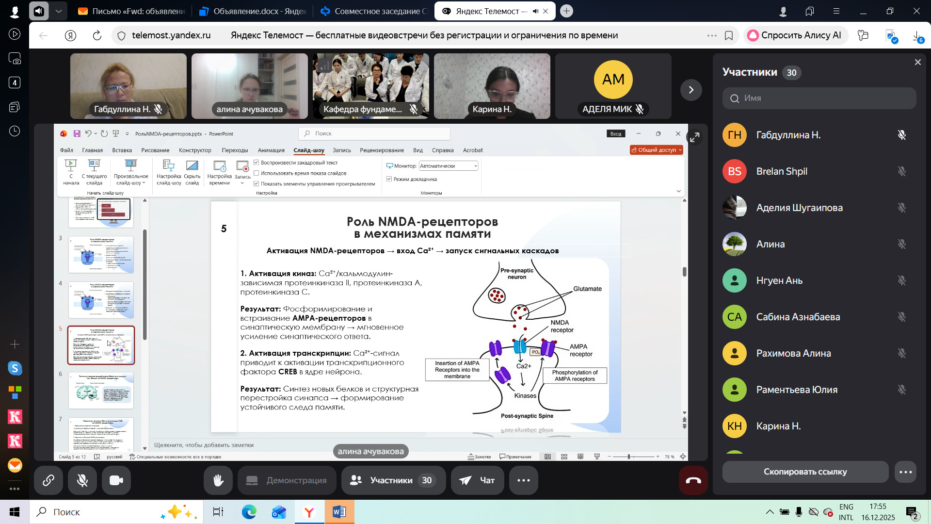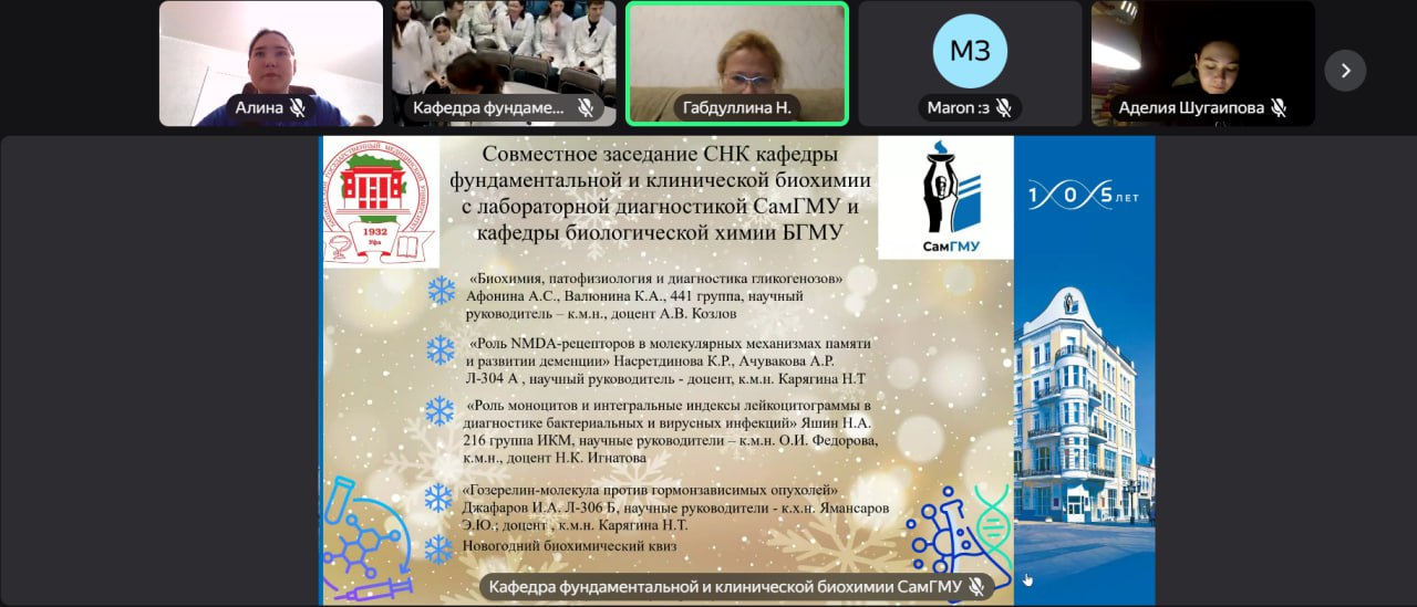 16.12.2025 г. состоялось совместное заседание научного кружка кафедры фундаментальной и клинической биохимии с лабораторной диагностикой ФГБОУ ВО СамГМУ Минздрава России и научного кружка кафедры биологической химии ФГБОУ ВО БГМУ Минздрава России в онлайн-формате! На заседании присутствовали зав. кафедрой фундаментальной и клинической биохимии с лабораторной диагностикой СамГМУ д. м. н., профессор Гусякова О.А., з. д. н. РФ, д. м. н., профессор Гильмиярова Ф. Н., руководитель научного кружка по биохимии СамГМУ, к.фарм.н., доцент Жданова А.В., руководитель научного кружка по биохимии БГМУ, к.м.н., доцент Карягина Н.Т., к.б.н., доцент кафедры биологической химии Абдуллина Г.М., к.м.н., доцент кафедры биологической химии Меньшикова И.А., к.фарм.н., ассистент Шамсутдинова С.Р., студенты-кружковцы. В совместном заседании участвовало 75 студентов.