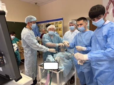1-8 ноября 2024 года в рамках образовательной политики программы «Приоритет-2030» и в целях совершенствования лапароскопических навыков и хирургических знаний среди обучающихся и практических врачей прошел курс повышения квалификации. «Неотложная эндоскопическая, хирургическая помощь». Занятия проводились на кафедре топографической анатомии и оперативной хирургии под руководством заведующих кафедрами топографической анатомии и оперативной хирургии д.м.н., профессора Хидиятова И.И., факультетской хирургии д.м.н., профессора Тимербулатова М.В., анестезиологии и реаниматологии д.м.н., профессора Лутфрахманова И.И. Цикл состоял из теоретической части, в ходе которой разбирали основные принципы выполнения лапароскопических операций, а также техническое обеспечение операционной, эндоскопической стойки и организационные моменты. Практическая часть заключалась выполнении различных оперативных вмешательств с применением лапароскопической техники на живых моделях в условиях искусственной вентиляции легких (WetLab). Были выполнены холецистэктомия, ушивание прободных отверстий желудка и тонкой кишки, наложение межкишечных анастомозов, нефрэктомия и ряд других операций. Схема выполнения операций состояла в самостоятельном выполнении операций несколькими курсантами под руководством специалиста. При отсутствии опыта у курсантов, в операции участвовал обучающий специалист. Всего в обучении приняли участие 15 курсантов разного опыта и степени подготовки, все отметили большую пользу от такого рода курсов, которые выгодно отличаются от чисто теоретических занятий.