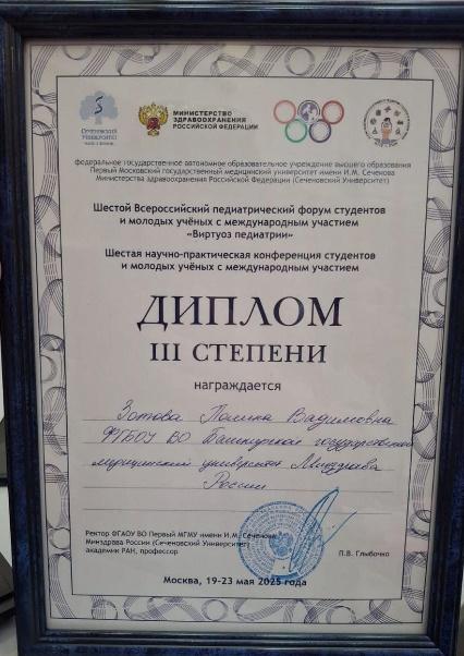 · Организация, участие, подготовка обучающихся для олимпиады «Вторая всероссийская педиатрическая междисциплинарная студенческая олимпиада «Клинический дебют» с международным участием в рамках Всероссийского педиатрического форума студентов и молодых учёных с международным участием «Виртуозы педиатрии», 20-24 мая 2024 г., Москва. Команда СНО кафедры заняла 3 место (подготовка: Имаева Л.Р.).
