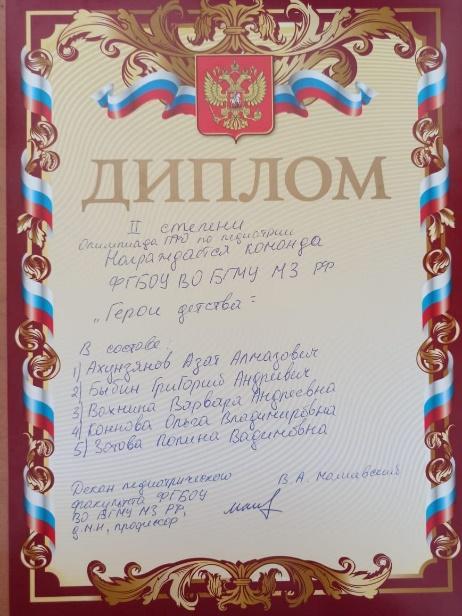 · Организация, участие, подготовка обучающихся для олимпиады «Первая педиатрическая междисциплинарная студенческая олимпиада «Клинический дебют» с международным участием в рамках Всероссийского форума студентов и молодых учёных с международным участием «Виртуозы педиатрии», Москва, 2023 года.