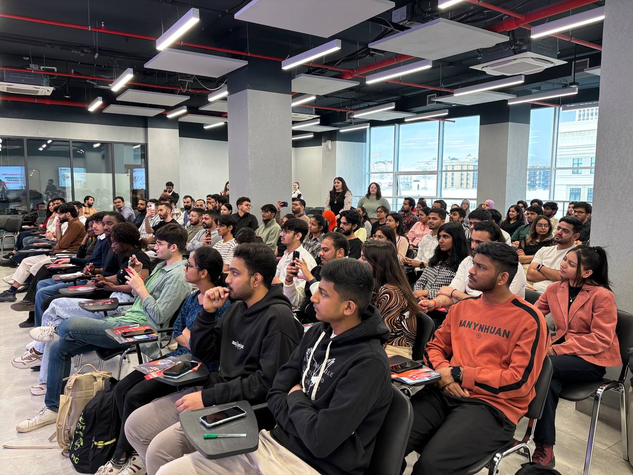 In the building No. 8, the main site of the Total Dictation worked. Here for the participants the text was dictated by the actress of the National Youth Theater named after Mustai Karim Yulia Nyrkova. 113 people joined the dictation.