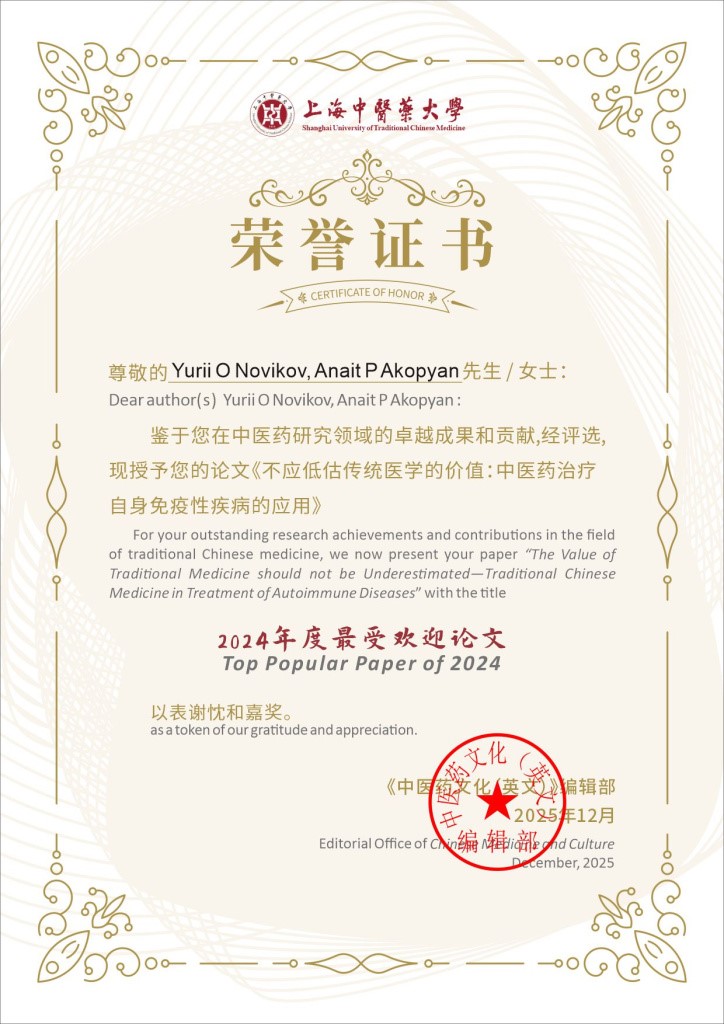 In 2024, the Chinese academic journal "Chinese Medicine and Culture" (Impact Factor 0.5, Q2) published an article by employees of our university prof. Yu.O. Novikova (Department of Neurosurgery and Medical Rehabilitation) and Associate Professor. A.P. Hakobyan (Department of Neurology and Neurorehabilitation) "THE USE OF TRADITIONAL CHINESE MEDICINE IN THE TREATMENT OF AUTOIMMUNE DISEASES OF THE NERVOUS SYSTEM" CHINESE MEDICINE IN TREATING AUTOIMMUNE DISEASES OF NERVOUS SYSTEM).