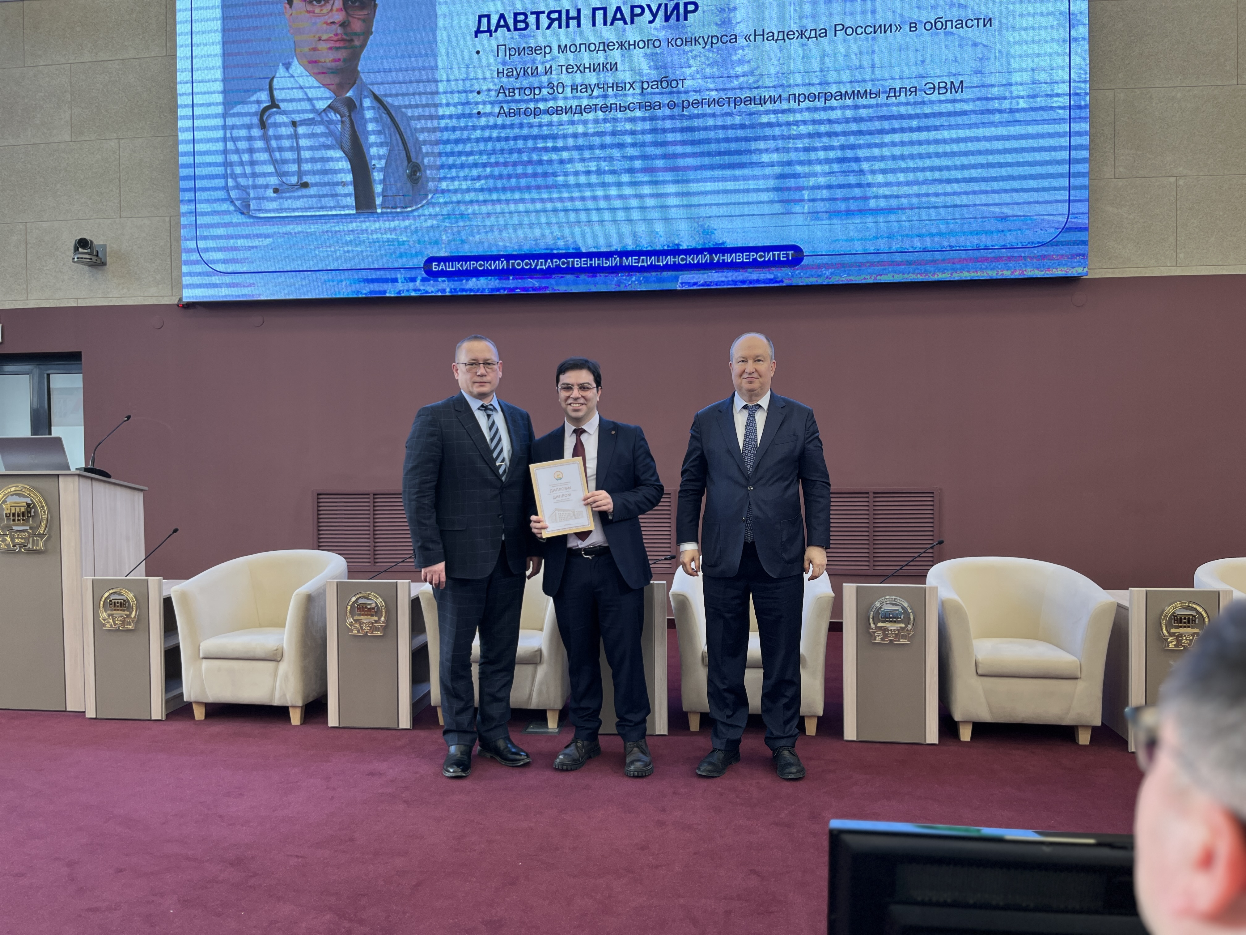 Паруйру Давтяну — аспиранту 3 курса направления «Клиническая медицина», призеру молодежного конкурса «Надежда России» в области науки и техники, автору 30 научных работ и свидетельства о регистрации программы для ЭВМ;