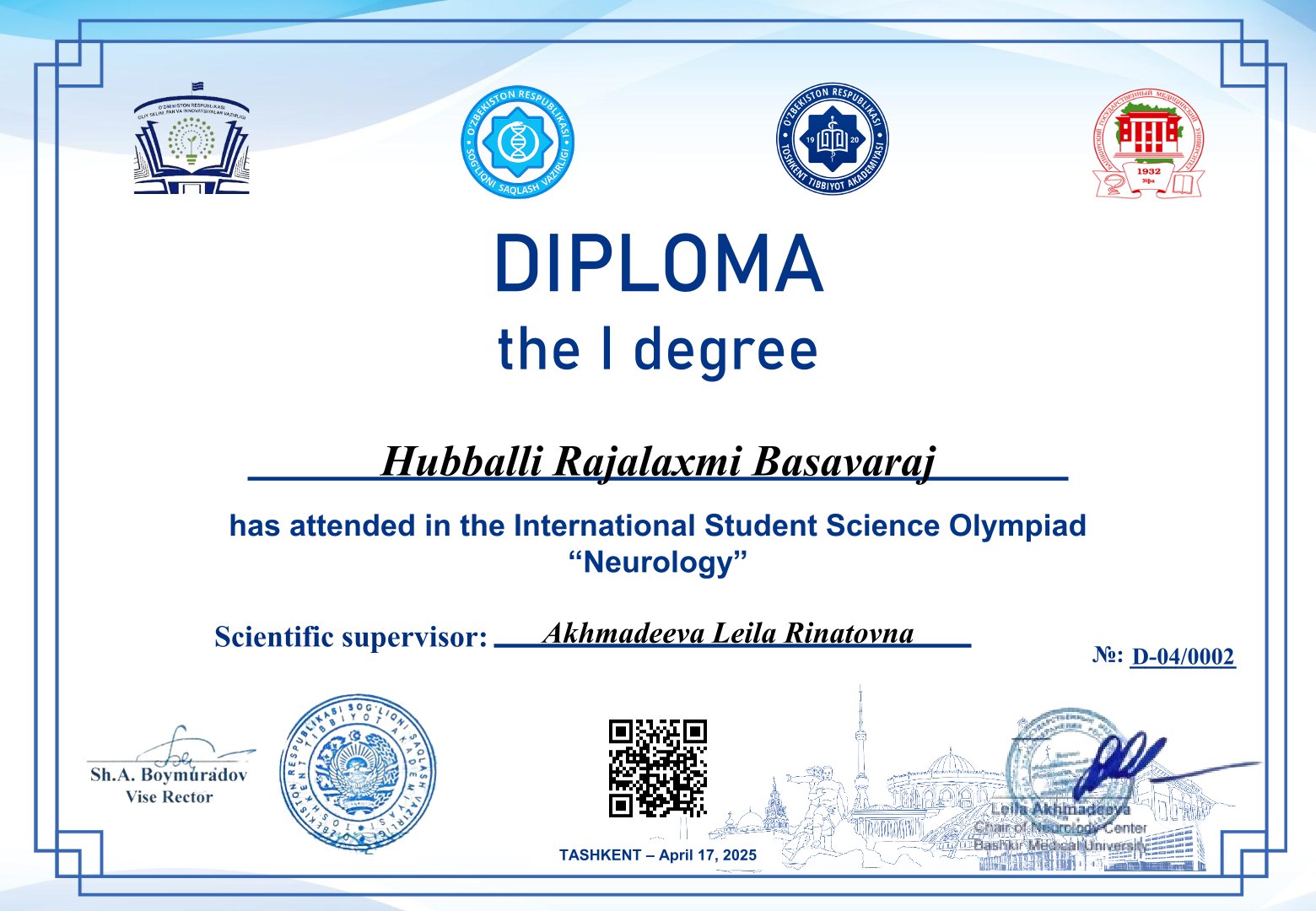 Совместно с Ташкентской медицинской академией 17 апреля 2025г БГМУ провел международную предметную олимпиаду по неврологии в гибридном формате.
