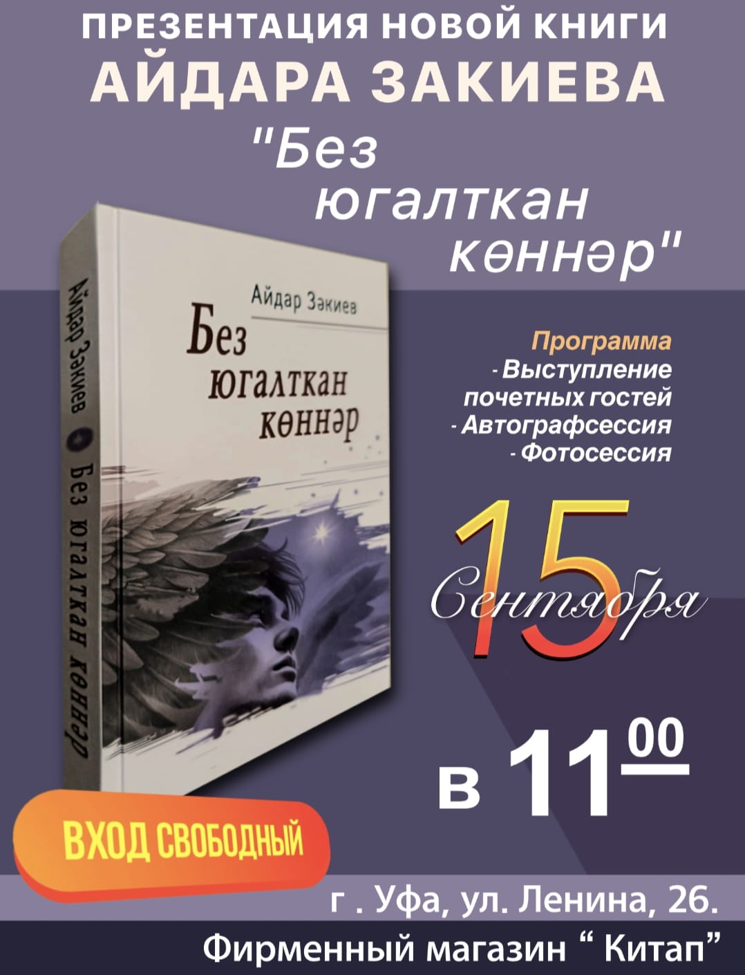 15 сентября 2025 г. в фирменном магазине издательства "Китап" им.З. Биишевой состоялась презентация новой книги татарского писателя, прозаика, журналиста Айдара Закиева. В книгу "Потерянные дни" - "Без югалткан көннәр" (на татарском языке) вошли рассказы и повести Айдара. Это третья книга автора. На мероприятие пришли коллеги, друзья, родственники, поклонники Айдара Закиева.