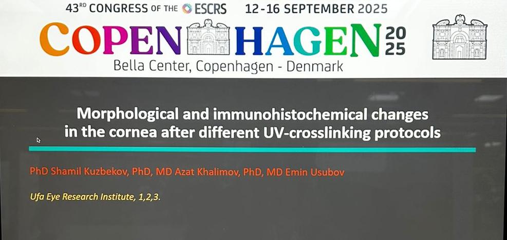 Главный врач Уфимского НИИ глазных болезней, к.м.н. Кузбеков Шамиль Ришатович представил доклад на английском языке о морфологических и иммунногистохимических изменениях роговицы после проведения кросс-линкинга – “Morphological and immunohistochemical changes in the cornea after different UV-crosslinking protocols” (авторы: Кузбеков Ш.Р., Халимов А.Р., Усубов Э.Л.).