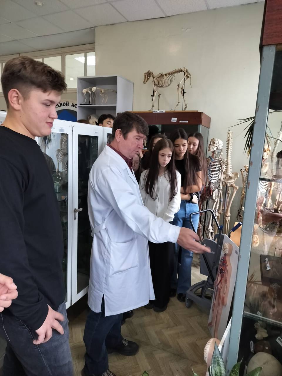 Школьники посетили музей кафедры анатомии доцент к.б.н. Почуева Наталья Николаевна и ассистент кафедры Мифтахутдинов Руслан Раисович рассказали о музее и анатомических экспонатах, д.м.н, профессор Каюмов Фарит Амирьянович ознакомил ребят с музейными экспонатами кафедры гистологии.