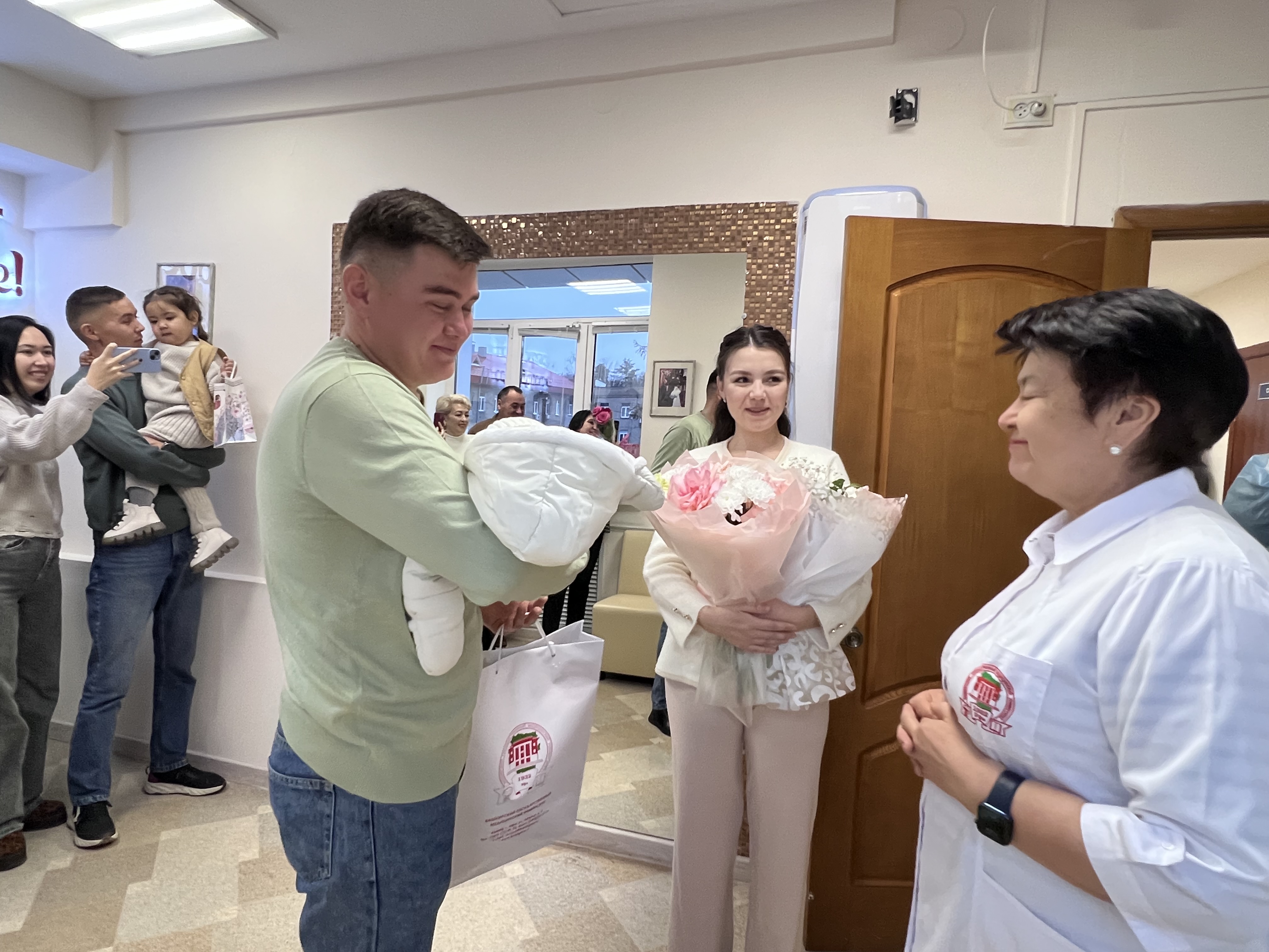 Добро пожаловать в этот мир! Говорим мы новороженным. Все семьи ушли с подарками - заведующая кафедрой акушерства и гинекологи №2 Альфия Ящук вручила для мам и их детей удобную подушку для кормления