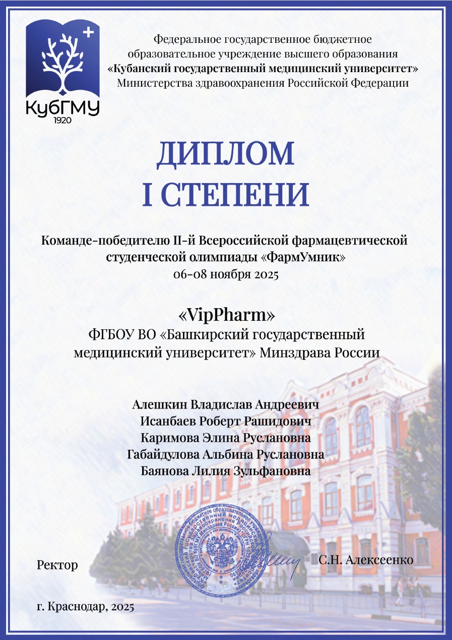 Башкирский государственный медицинский университет представляла команда «VipPharm», в состав которой вошли следующие студенты: Алешкин Владислав, Баянова Лилия, Габайдулова Альбина, Исанбаев Роберт и Каримова Элина. Руководство командой осуществляли заведующий кафедрой фармации, д.фарм.н., профессор В.А. Катаев и доцент кафедры фармации, к.фарм.н. А.Х. Гайсаров.