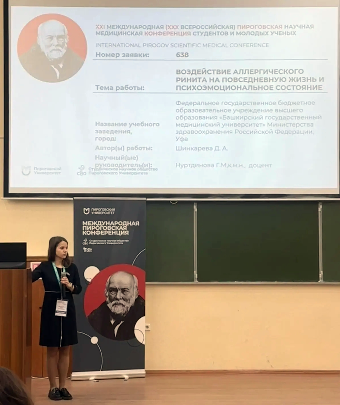 - Дарья Шинкарева, студентка 4 курса лечебного факультета, выступила с докладом на тему «Воздействие аллергического ринита на повседневную жизнь и психоэмоциональное состояние». Научный руководитель - доцент кафедры пропедевтики внутренних болезней, к.м.н. Г.М. Нуртдинова. Исследование вызвало живой интерес у жюри и аудитории секции «Болезни головы и шеи».