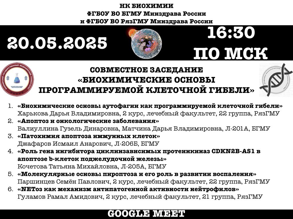 Совместное заседание научных кружков по биохимии ФГБОУ ВО БГМУ Минздрава России и ФГБОУ ВО РязГМУ Минздрава России «БИОХИМИЧЕСКИЕ ОСНОВЫ ПРОГРАММИРУЕМОЙ КЛЕТОЧНОЙ ГИБЕЛИ» состоится 20.05.2025 в 18:30 (в 16:30 по МСК) в онлайн-формате.