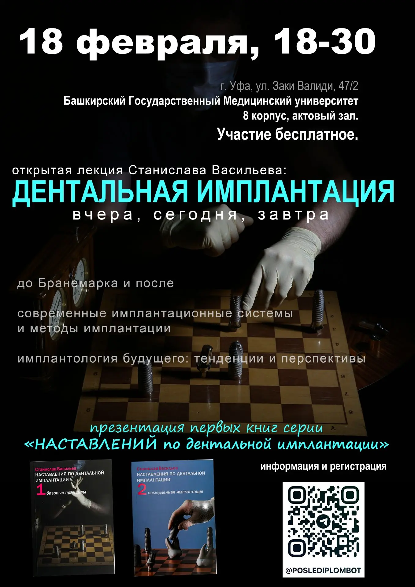 На эти и другие вопросы на открытой лекции ответит Станислав Васильев – выпускник БГМУ Минздрава России, ведущий российский стоматолог-хирург, имплантолог, автор книги "Наставление по дентальной имплантации", главный врач КЛИНИКИ ИН (Москва).