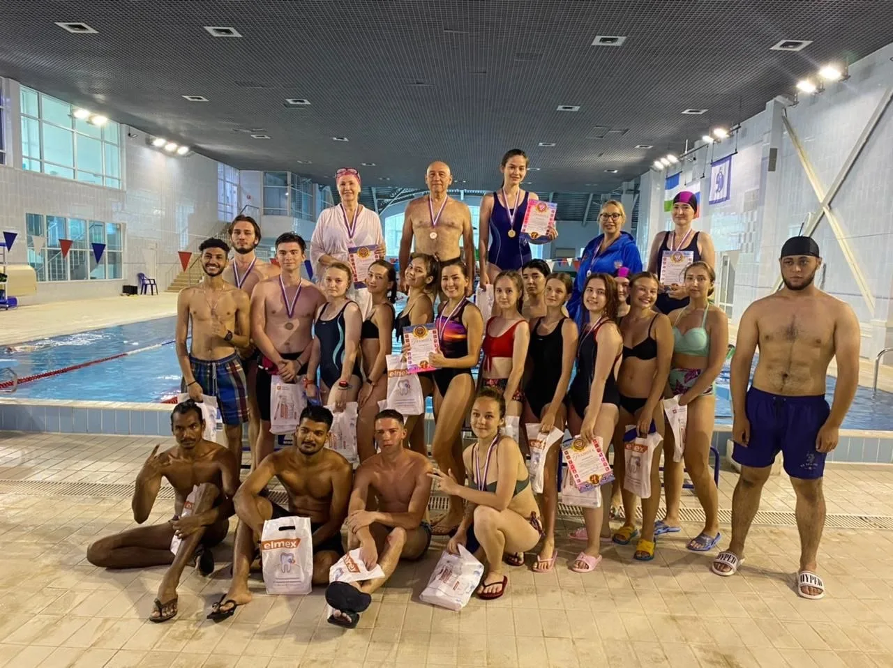 Необходимые принадлежности для плавания: пакет для сменной обуви, сланцы, купальник/плавки, шапочка, плавательные очки, шампунь, гель для душа, мочалка, полотенце.