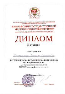 Для участия в 84-ой Всероссийской научной конференции студентов и молодых ученых с международным участием «Вопросы теоретической и практической медицины» (г. Уфа, 23-24 апреля 2019 г.), кафедрой были подготовлены 9 обучающихся на секцию «Гигиена, эпидемиология, профессиональные болезни», среди которых Ахметова А.В. (МПФ-601А, науч.рук. д.м.н. Мухаметзянов А.М.) награждена дипломом III степени. Так же кураторами секции отмечены доклады следующих студентов, подготовленных кафедрой эпидемиологии: Гирфатуллина Э.Р. (МПФ-601А, науч.рук. д.м.н. Мухаметзянов А.М.) - диплом за глубину раскрытия темы научного доклада, Гумерова Э.М. (МПФ-602А, науч.рук. к.м.н. Асылгареева Г.М.) - диплом за развитие премордиального подхода к оценке риска, Ишбулатова А.С. (МПФ-602А, науч.рук. Ибраева Л.Р.) - диплом за эпидемиологическую оценку факторов риска в условиях профессиональной деятельности, Шарифуллина Р.Д. (МПФ-601А, науч.рук. д.м.н. Мухаметзянов А.М.) – диплом за прикладной характер полученных результатов.