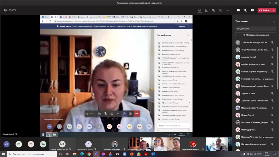 On April 21, 2021, Professor Elena Savelyeva held a large online conference Topical issues of comorbid neurology, which was attended by teachers of Bashkir State Medical University (Professor-neurologist Leyla Akhmadeeva, assistant-otorhinolaryngologist Olga Izmailova), the Western Kazakhstan Medical University from Aktobe (Dr. Dinmukhamed Ayaganov and his doctoral student Merey Aliyeva), Samarkand State Medical Institute (Sohiba Khakimova, Head of the Department of Neurology and Neurosurgery of the Faculty of Postgraduate Education, and Aliye Velilyaeva, Head of the Department of Psychiatry, medical psychology and addictology). The issues of dizziness, pain, asthenia, cephalgia, COVID-19, and the use of modern methods for the study of ENT organs were discussed.
