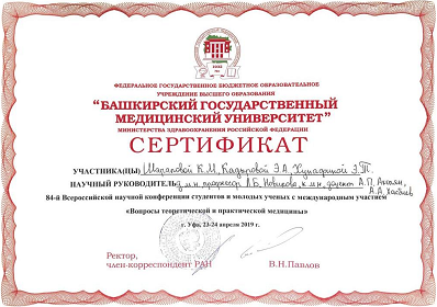 24 апреля 2019г. в №10 учебном корпусе Башкирского государственного медицинского университета состоялась 84-я Всероссийская научная конференция студентов и молодых ученых с международным участием «Вопросы теоретической и практической медицины». Председатель секции «Неврология, наркология и психиатрия» была проф. Ахмадеева Л.Р. Кураторами секции были: проф. Л.Б. Новикова, проф. Магжанов Р.В., проф. Юлдашев В.Л., доц. Урицкий Б.Л., доц. С.В. Медведева, асс. Бакиров Л.Р., асс. Рахматуллин А.Р. и др. Ординаторы кафедры неврологии ИДПО представили следующие доклады: Кадырова Э.Р., Хунафина Э.Т. «Реабилитация больных, перенесших ишемический инсульт», «Стабилометрический тренинг с использованием биологической обратной связи различной модальности у больных, перенесших инсульт», за что были награждены дипломом и сертификатами. По окончанию выступлений состоялась активная дискуссия, задавалось большое количество вопросов докладчикам. Все выступающие с докладами получили сертификаты участника молодежной научной конференции.
