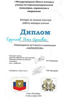 Ординатор 2 года обучения кафедры психиатрии и наркологии с курсом ИДПО Ефремов Илья Сергеевич под руководством доцента Асадуллина Азата Раилевича занял II место в номинации «Наркология» докладом «Генетические маркеры риска формирования зависимости от синтетических катинонов» в I Международной школе молодых ученых по персонализированной психиатрии, наркологии и неврологии, которая проходила 17-18 октября 2019 года в Санкт-Петербурге.