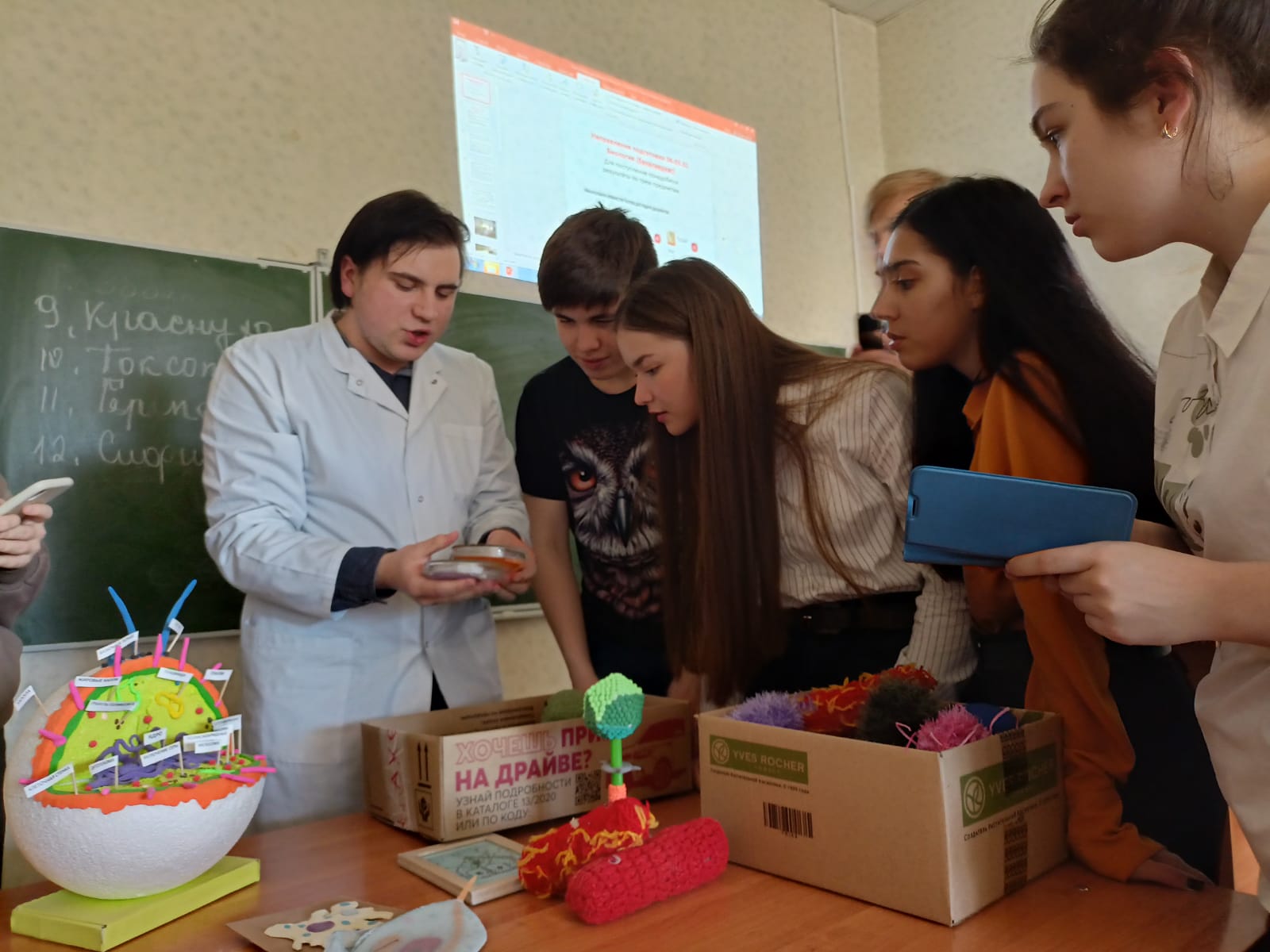 На минутке занимательной медицины студент 4 курса направления подготовки 06.03.01 Биология Первушин Андрей Викторович продемонстрировал макеты клеток, вирусов и бактерий и в непринужденной обстановке ответил на интересующие школьников вопросы.