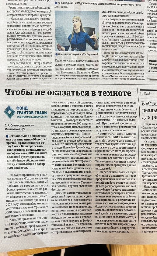 Проект «Сохраним зрение при диабете вместе», инициатором которого является НКО региональная общественная организация «Общество врачей-офтальмологов Республики Башкортостан», в 2024 году стал победителем второго конкурса Фонда грантов Главы РБ на развитие институтов гражданского общества и реализацию социально значимых проектов. В ноябре прошлого года команда проекта, состоящая из врачей офтальмологов Уфимского НИИ глазных болезней БГМУ Минздрава России, приступила к его реализации.