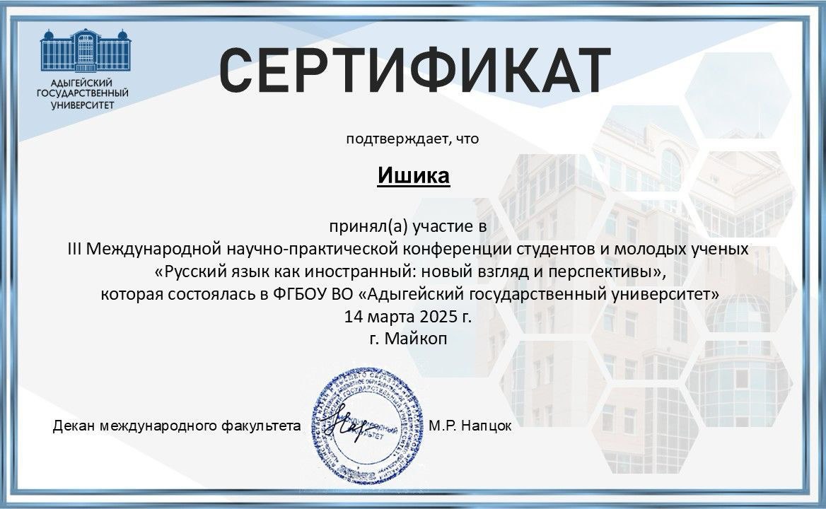 14 марта 2025 года студенты Башкирского государственного медицинского университета выступили с докладами на III Международной научно-практической конференции студентов и молодых ученых «Русский язык как иностранный: новый взгляд и перспективы», организованной Адыгейским государственным университетом.