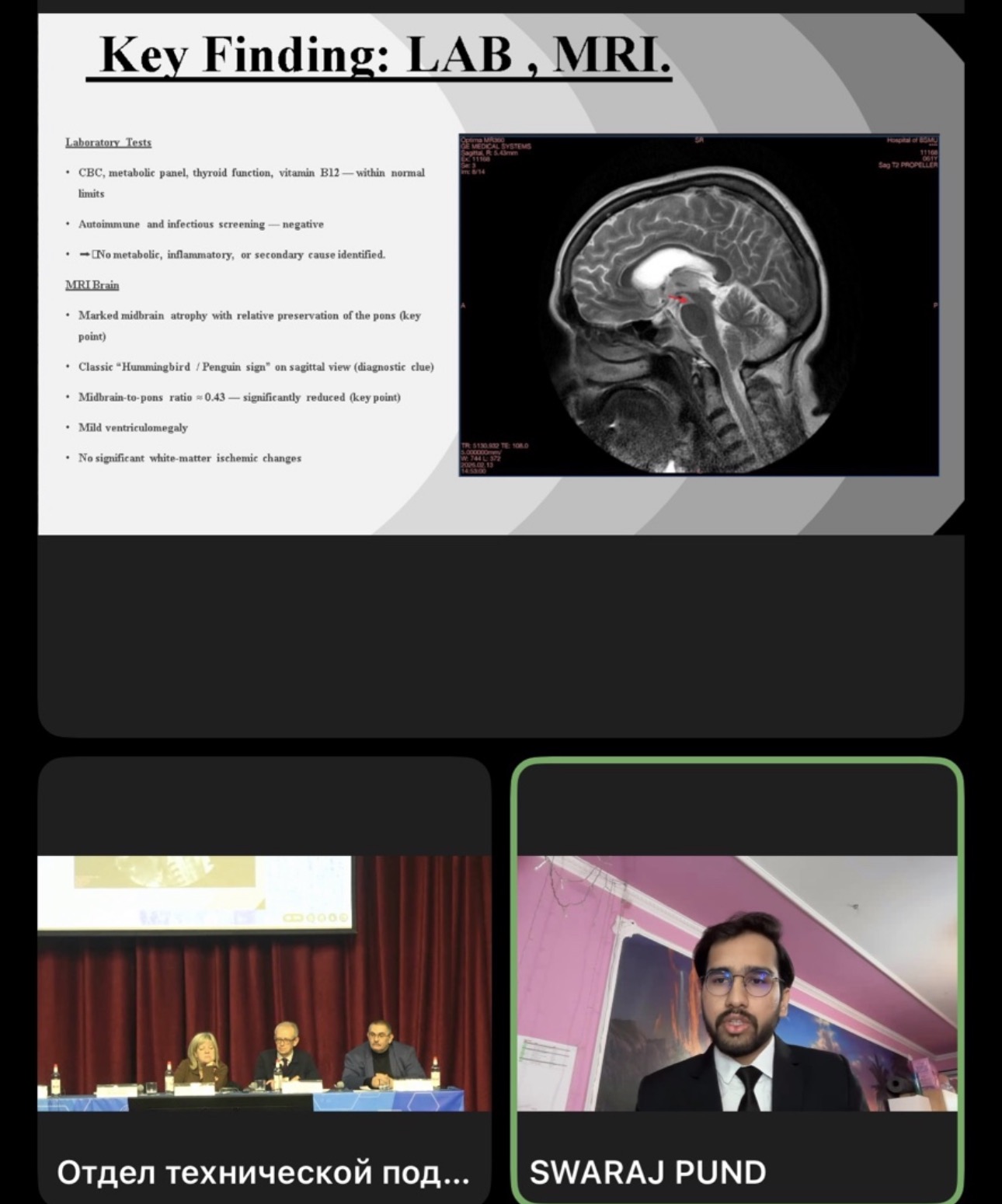 Первое место заслуженно получил четверокурсник из Индии Сварадж Пунд, блестяще выступивший на английском языке о пациентке с прогрессирующим надъядерным параличом, которую он со старостой студенческого научного кружка кафедры неврологии Фатихой Махмутовой (4 курс) наблюдал в Клинике БГМУ.